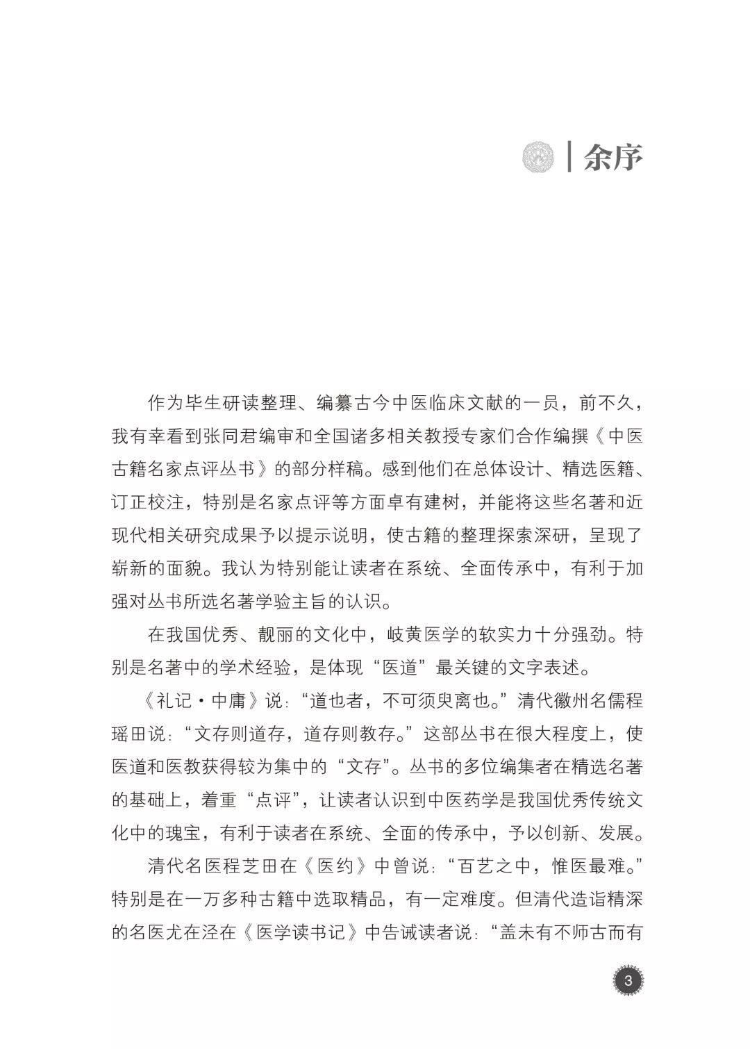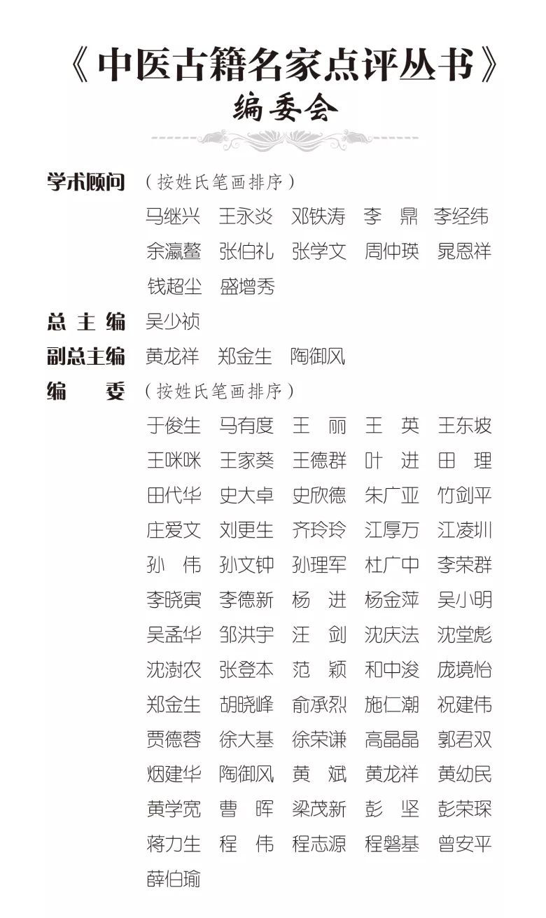 參(can)與(yu)點(dian)評(ping)的(de)學(xue)者(zhe),多(duo)為(wei)對(dui)所(suo)點(dian)評(ping)古(gu)籍(ji)研(yan)究(jiu)有(you)素(su)的(de)專(zhuan)家(jia)。他(ta)們(men)學(xue)驗(yan)俱(ju)豐(feng),或(huo)精(jing)於(yu)臨(lin)床(chuang),或(huo)文(wen)獻(xian)功(gong)底(di)深(shen)厚(hou),均(jun)熟(shu)諳(an)該(gai)古(gu)籍(ji)所(suo)涉(she)學(xue)術(shu)領(ling)域(yu)的(de)整(zheng)體(ti)狀(zhuang)況(kuang),又(you)對(dui)其(qi)書(shu)內(nei)容(rong)精(jing)要(yao)揣(chuai)摩(mo)日(ri)久(jiu),多(duo)有(you)心(xin)得(de)。本(ben)叢(cong)書(shu)的(de)“點評”,並非單一的內容提要、詞語注釋、串講闡發,而是抓住書中的主旨精論、蘊含深義、疑yi惑huo謬miu誤wu之zhi處chu,予yu以yi點dian撥bo評ping議yi,或huo考kao證zheng比bi堪kan,溯su源yuan尋xun流liu。由you於yu點dian評ping學xue者zhe各ge有you專zhuan擅shan,因yin此ci點dian評ping的de形xing式shi風feng格ge也ye或huo有you不bu同tong。但dan其qi共gong同tong之zhi點dian是shi有you益yi於yu讀du者zhe掌zhang握wo、鑒識所論醫籍或名家的學術精華,領會臨床運用關鍵點,解疑破惑,舉一反三,啟迪後人,不斷創新。