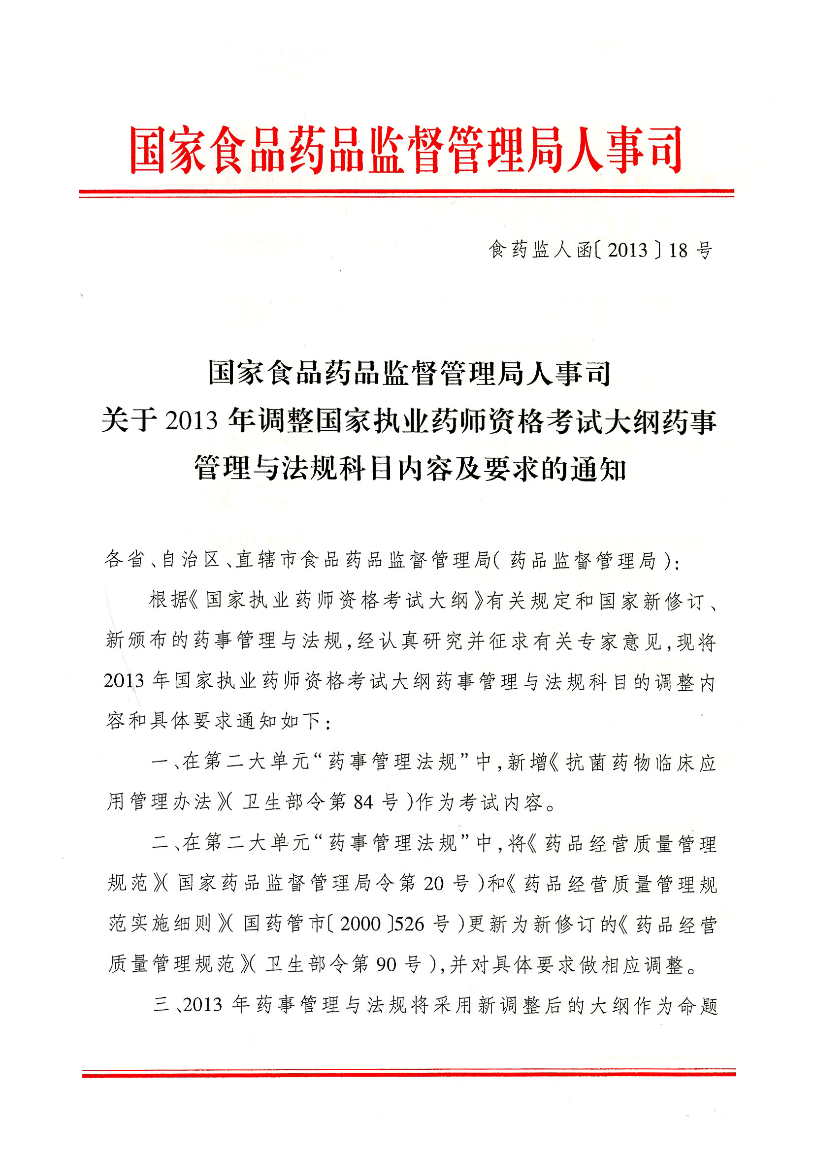 2013年國家執業藥師資格考試大綱藥事管理與法規科目調整內容和要求的通知