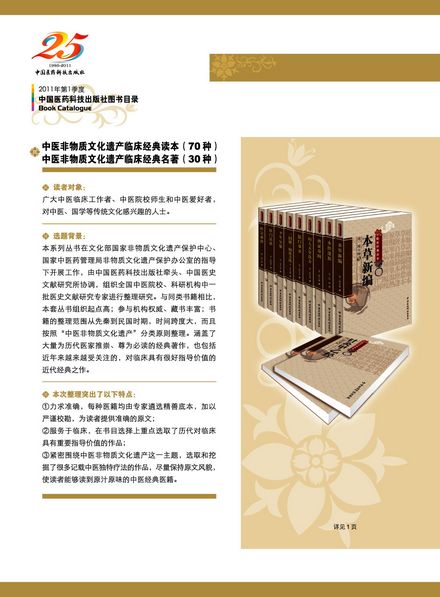 2011年1月,我社隆重推出《中醫非物質文化遺產臨床經典讀本》係列叢書,由王永炎、張伯禮、餘瀛鼇、馬繼興、王新陸、鄧鐵濤等14位(wei)中(zhong)醫(yi)名(ming)家(jia)任(ren)學(xue)術(shu)顧(gu)問(wen),國(guo)家(jia)中(zhong)醫(yi)藥(yao)管(guan)理(li)局(ju)中(zhong)醫(yi)文(wen)獻(xian)學(xue)科(ke)帶(dai)頭(tou)人(ren),國(guo)家(jia)非(fei)物(wu)質(zhi)文(wen)化(hua)遺(yi)產(chan)保(bao)護(hu)工(gong)作(zuo)專(zhuan)家(jia)委(wei)員(yuan)會(hui)委(wei)員(yuan)柳(liu)長(chang)華(hua)和(he)中(zhong)國(guo)醫(yi)藥(yao)科(ke)技(ji)出(chu)版(ban)社(she)社(she)長(chang)兼(jian)總(zong)編(bian)輯(ji)吳(wu)少(shao)禎(zhen)任(ren)總(zong)主(zhu)編(bian)。