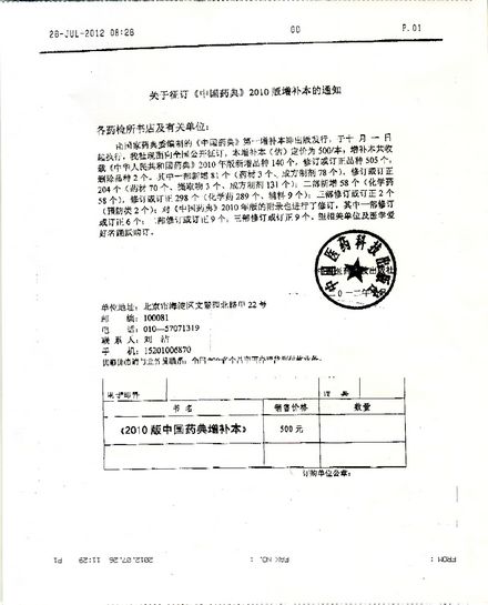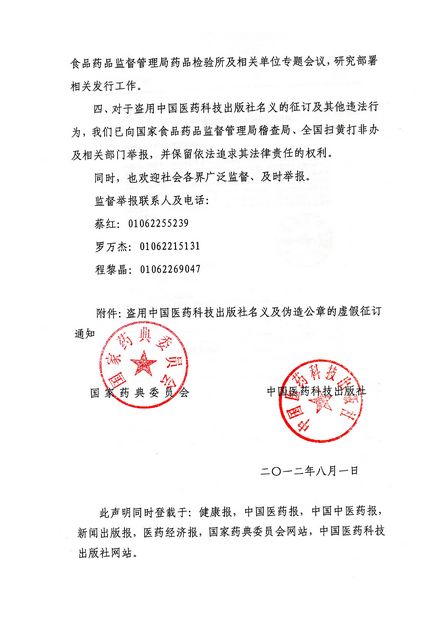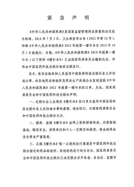 一、近期社會上出現的《增補本》征訂單為盜用中國醫藥科技出版社名義及偽造公章的虛假、違法征訂,與國家藥典委員會和中國醫藥科技出版社無關。
