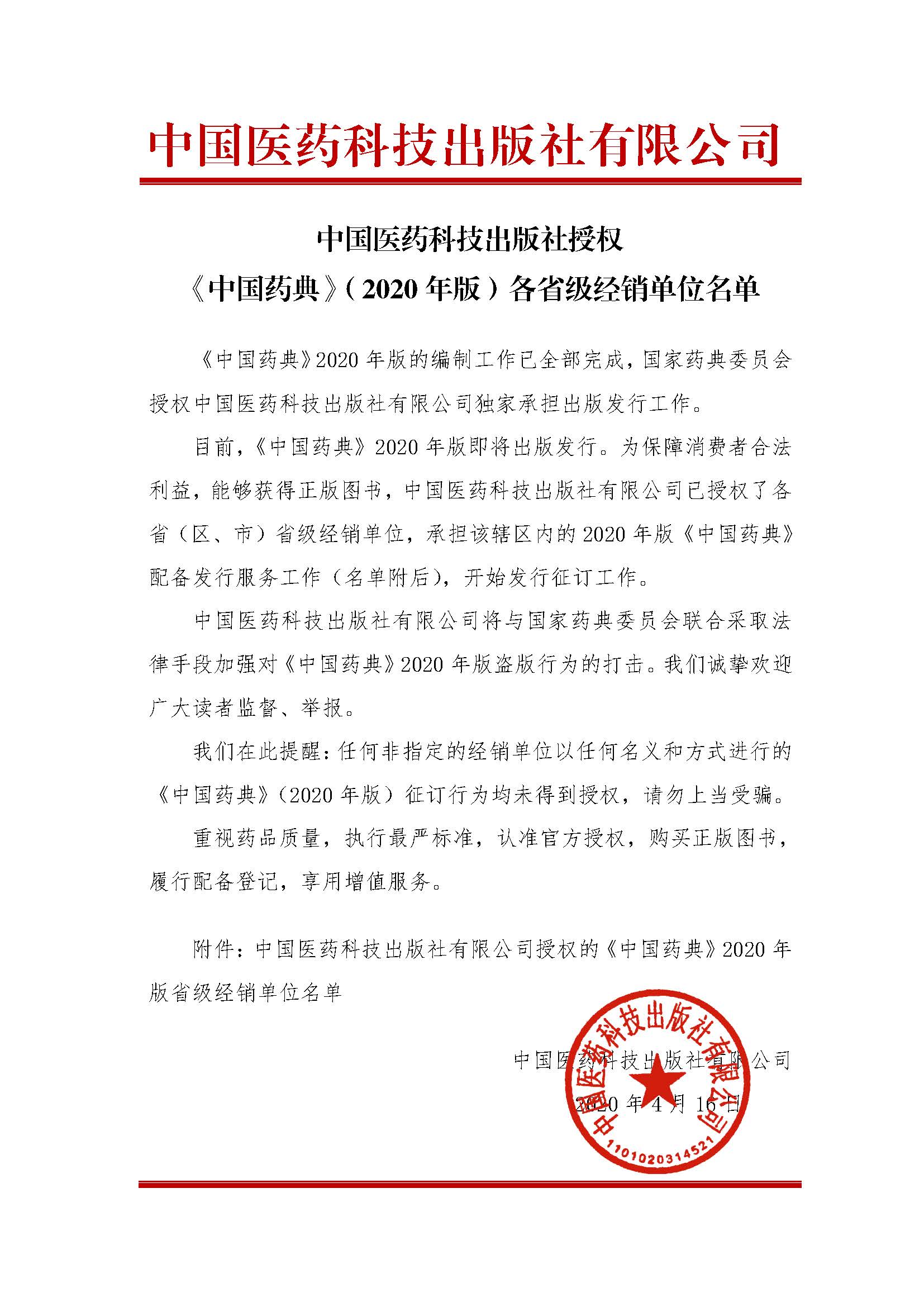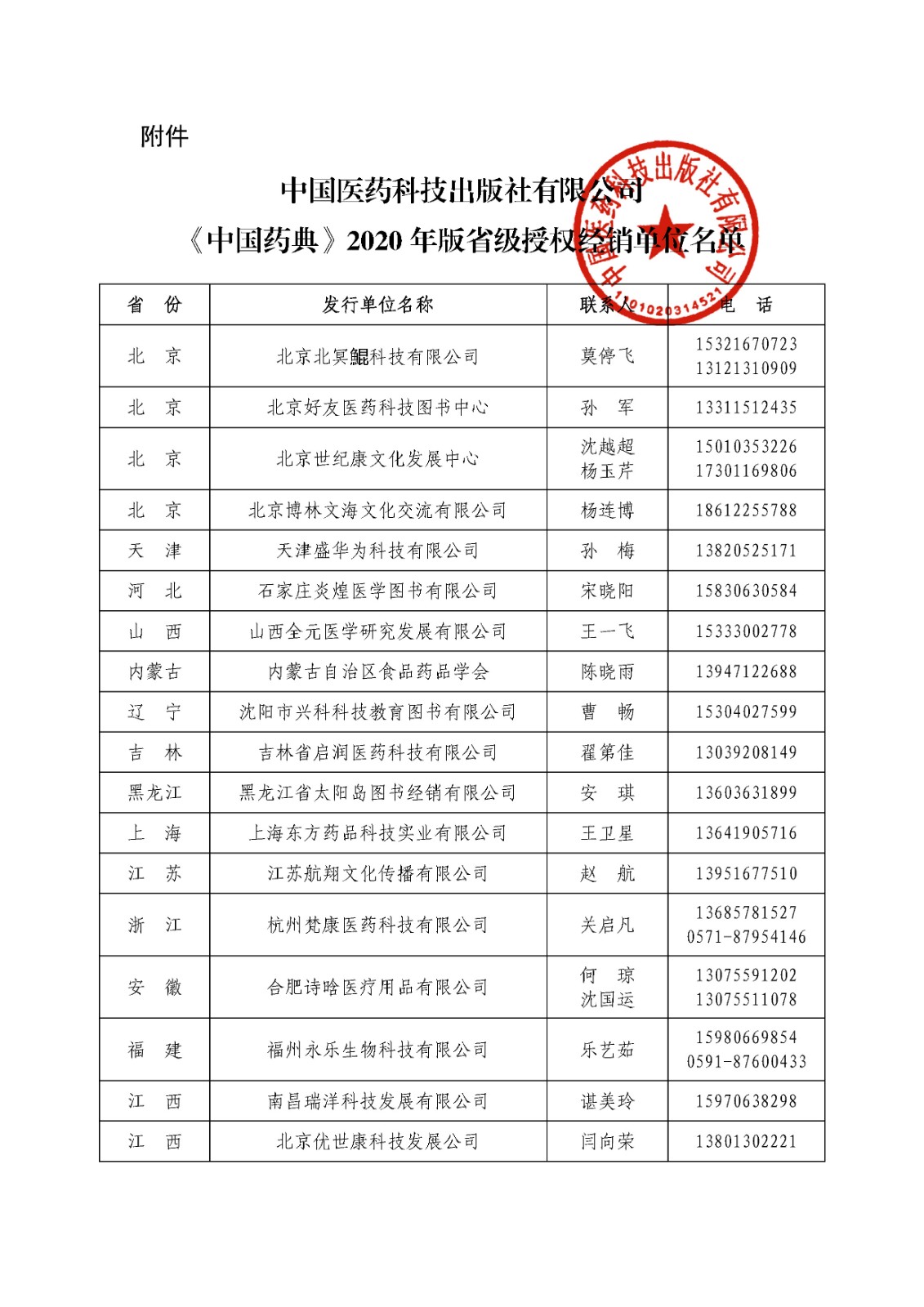 中國醫藥科技出版社授權《中國藥典》(2020年版)各省級經銷單位名